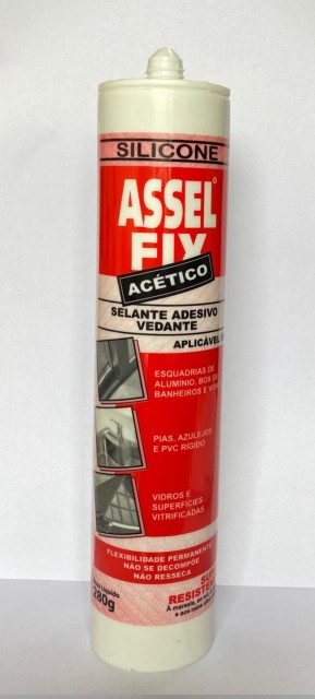 O SILICONE ASSELFIX ACÉTICO, adere em vidro, alumínio, materiais esmaltados e alguns tipos de plásticos. Na sua fórmula contém fungicida que inibe totalmente a criação de fungos, principalmente em ambientes úmidos. A sua cura é promovida quando o produto entra em contato com o oxigênio. A formação de película inicia-se após 10 minutos da aplicação e a sua cura total após 24 horas. Resiste a temperaturas de -30° C a 210° C. È fornecido nas cores: INCOLOR, BRANCO, PRETO, ALUMINIO, BRONZE E VERMELHO.